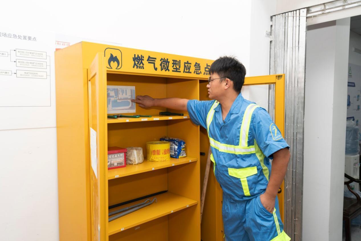 在北京街环卫驿站,一个高约1.8米的燃气济急装备柜非常防守。柜内整皆摆放着管钳、扳手、十字镐、堵漏木楔等十余种济急器具,墙上张贴着燃气设施散播图和济急治理过程图,图文并茂、一目了然。