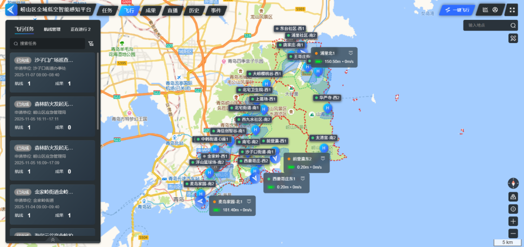 自2022年以来,为鼓舞低空感知在政务领域的愚弄,崂山区电子政务和大数据中心以知足政府各部门万般化的航行需求为指标,改进打造了全域低空智能感知平台,从“空中视角”灵验地补皆城市感知盲点,成为世界首个竣事无东谈主机组网自动航行、任务开脱定制、效果自动回传的低空政务场景愚弄案例,通过配置1套无东谈主机航行基础纪律,搭建2个航行做事平台,铸造4项中枢能力,会通N个愚弄场景,构建起一套“1+2+4+N”的低空政务愚弄体系,灵验取销传统无东谈主机愚弄时效性低、率领未方便、安全弗成控等问题,竣事了低空视角助力城市不休和社会惩处,进一步提高了政府不休水平。